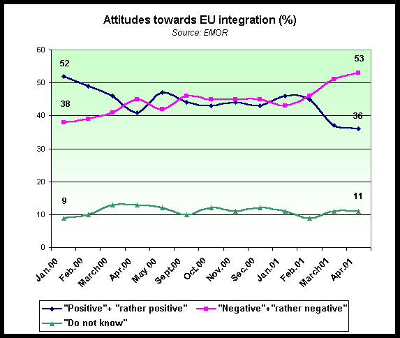 From the outset of conducting sociological studies, polls of the public opinion have shown that the attitude of the people of Estonia towards the accession of Estonia to the EU is neither overemotional nor overoptimistic, rather, it has been deliberating and guarded. In early 90ies, the EU had a positive image for 30 to 38 per cent of the people of Estonia while 1 to 5 per cent of the people had a negative opinion about it.