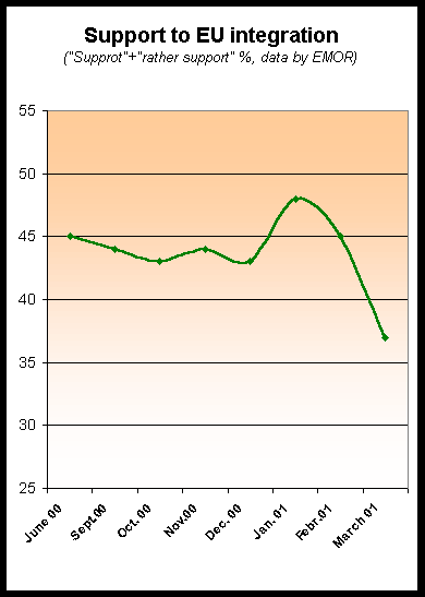 The optimism of the people of Estonia about the accession to the EU has diminished more and more together with complications in local political situation. It is evident that the hope that their personal life might change for the better is lost, although the main reason for the people to support Estonia's accession to the EU are not personal benefits.