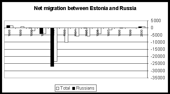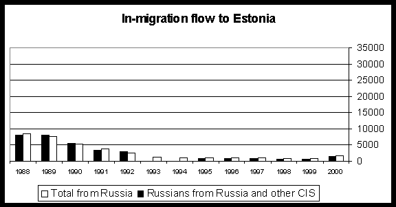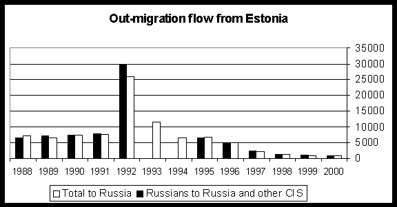As we can see from Chart 1 (Russian minority migration patterns), since the first years of 1990s the migrants follow the track caused by political change and psychological shock, leaving Estonia together with political leadership and Soviet army after the collapse of Soviet Union to Russia. According to the estimation of Ministry of Internal Affairs about 10-20 per cent of this wave emigrants have re-emigrated to Estonia during 1999-2000. At the same time, it was not clear, how many of these citizens had left Estonia during last few years. The Statistical Office of Estonia estimate that some 16 000 left Estonia for Russia during 1995-1999.